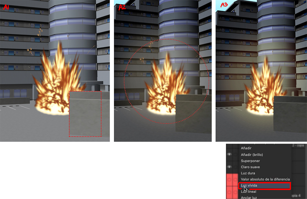 En este caso, la colocaremos en el interior del parking y borraremos la parte de la explosión que tapa ese pequeño muro delantero (A1). A continuación, crearemos una nueva capa y añadiremos un resplandor con la herramienta “Aerógrafo suave” (A2) para simular la luz del fuego. Después, cambiaremos el modo de combinación de la capa a “Luz vívida” (A3).