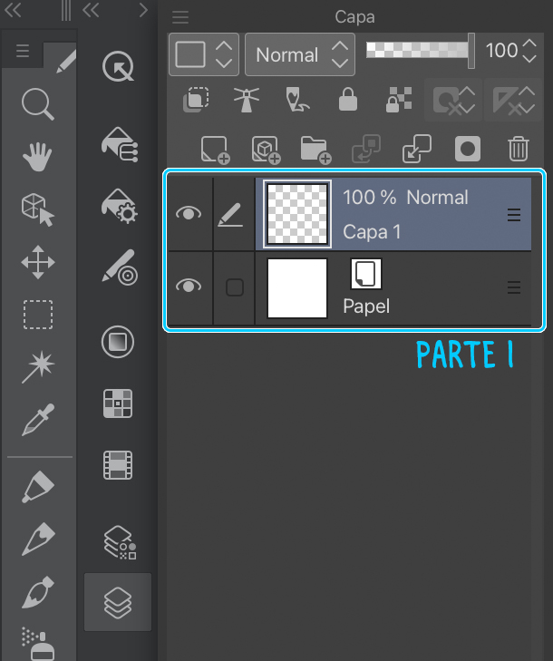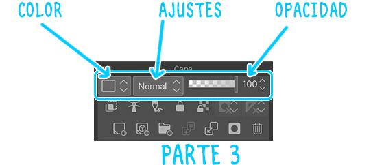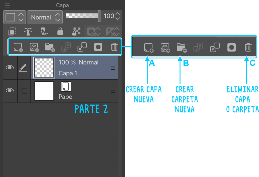La parte 2 de la imagen muestra las funciones básicas de gestión de capas (añadir capas, crear carpetas, eliminarlas…). Por el momento, nos centraremos en las funciones para crear capas, crear carpetas y eliminar ambas.