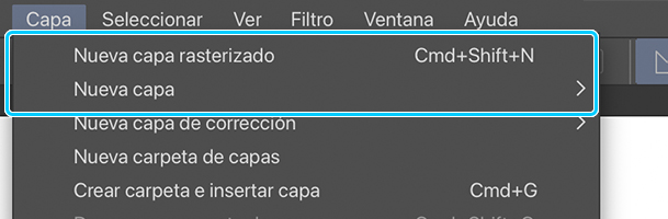 Hay dos formas de crear una capa nueva: seleccionando el icono de la paleta de capas o desde el menú Capa > Nueva capa rasterizado. También puedes crear otros tipos de capa desde el menú Capa > Nueva capa.