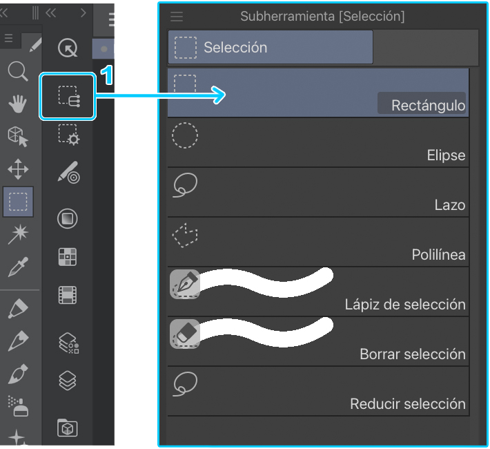 Al tocar el icono (1), podemos acceder a las subherramientas de selección. La subherramienta predeterminada nos permite crear una selección cuadrada o rectangular. También es posible crear áreas con formas de Elipse, formas personalizadas (Lazo) y poligonales (Polilínea) con el resto de subherramientas. Con la subherramienta siguiente (Lápiz de selección), podemos seleccionar un área pintándola como si usásemos un pincel.