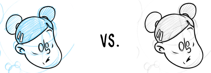 Aquí cambio el color de mi pincel a azul, ya que así es más fácil distinguir y organizar las líneas. Siempre dibujo mis bocetos en azul durante las fases iniciales. Además, el azul no interfiere al entintar el dibujo. Reservo las líneas negras para el line art final.