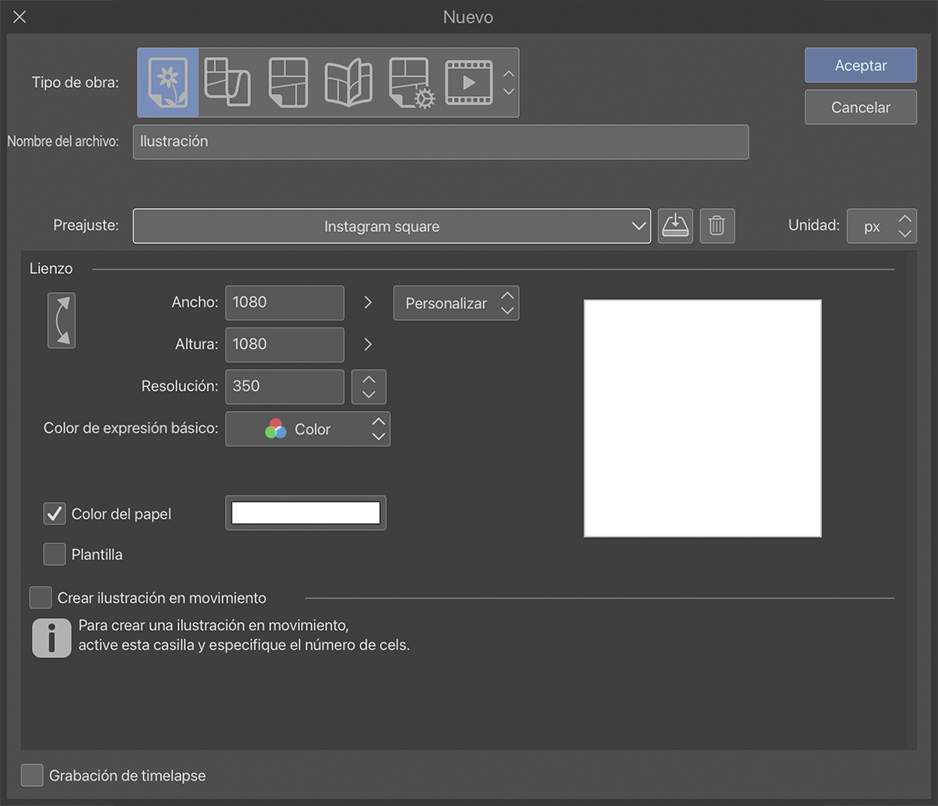 Antes de aceptar la configuración del lienzo de mi ilustración, voy a guardarla para no tener que volver a ajustarla. Para ello, la llamo Instagram square desde este mismo cuadro de diálogo, activo las opciones Plantilla y Color del papel y toco el icono de “Registrar como preajuste”. Ahora mi configuración está guardada en el menú desplegable de preajustes.