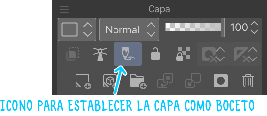 Termino de configurar mi capa estableciéndola como boceto. Para ello, vamos al menú de capas, mantenemos pulsada la capa y elegimos Ajustes de capa > Establecer capa como boceto en el menú contextual. También es posible hacer esto mismo tocando el icono indicado en la siguiente imagen.