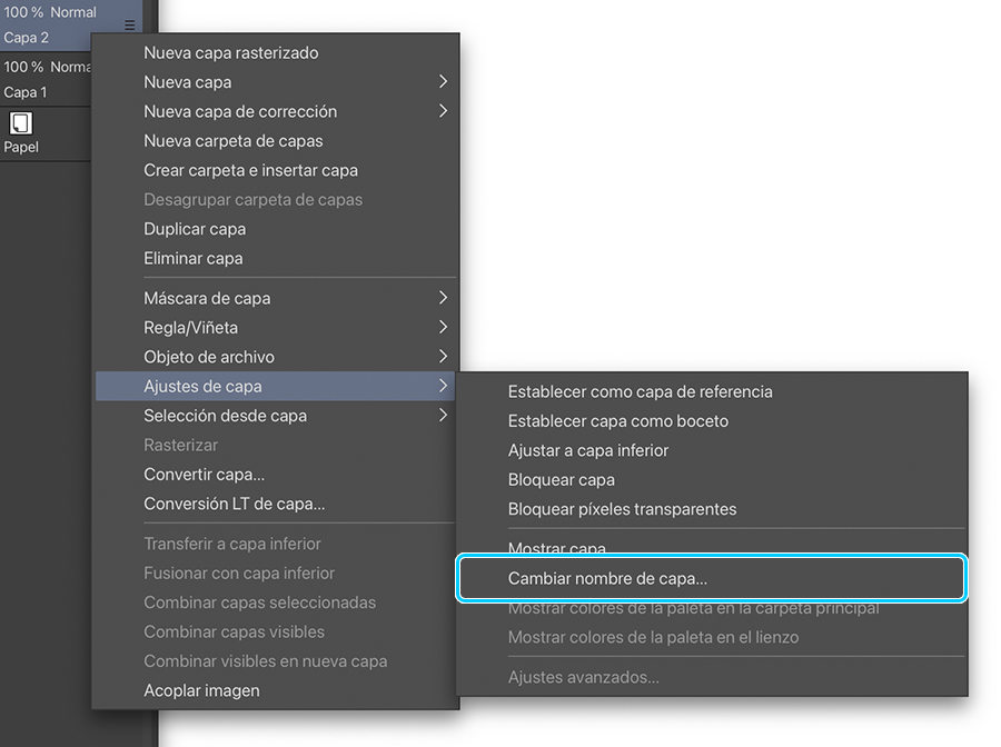 Creo una nueva capa para entintar mi boceto tocando el respectivo botón de la paleta de capas. Después, cambio el nombre de esta capa manteniéndola pulsada y seleccionando Ajustes de capa > Cambiar nombre de capa en el menú contextual. La llamo Entintado.