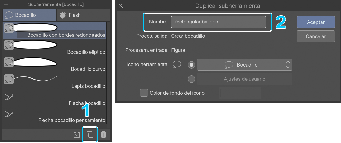 Después, selecciono la herramienta Bocadillo y abro la paleta de subherramientas para elegir el Bocadillo elíptico. Suelo usar bocadillos cuadrados o rectangulares para mis publicaciones de Instagram. También puedes crear una forma totalmente nueva tocando el icono (1) de la parte inferior de la paleta de subherramientas. A continuación, cambia el nombre (2), pulsa Aceptar y configura la nueva subherramienta para dibujar el bocadillo con ella.