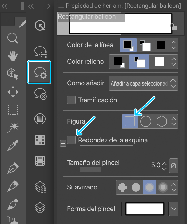 Desactiva la opción Redondez de la esquina si quieres un globo rectangular.