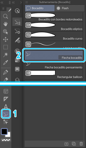 Por último, aún en la herramienta Bocadillo, selecciono la subherramienta Flecha bocadillo para dibujar la cola. Tenemos dos tipos de cola: la clásica y otra formada por burbujas para indicar pensamientos. Yo suelo dibujar las colas de mis bocadillos a mano con el lápiz.