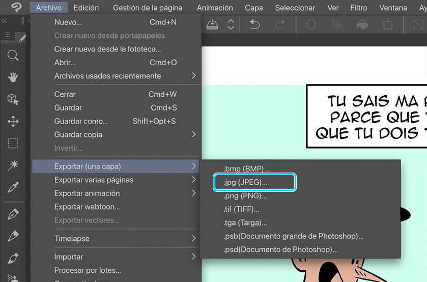 Ya solo queda exportar nuestro dibujo para publicarlo en Internet. Para ello, solo hay que ir al menú Archivo > Exportar (una capa) > .jpg (JPEG).
