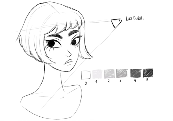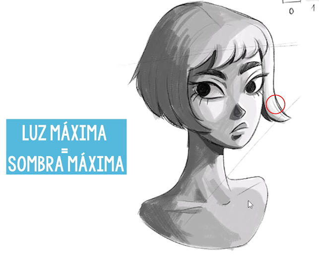 Otra cosa que debemos tener en cuenta es que las luces máximas, representadas con los blancos más puros, siempre estarán en los elementos más cercanos a la fuente de luz. En el caso de nuestro dibujo, si bien el hombro también está bastante iluminado, su luz no puede ser tan clara como la del rostro o la de los mechones del pelo más cercanos al foco.