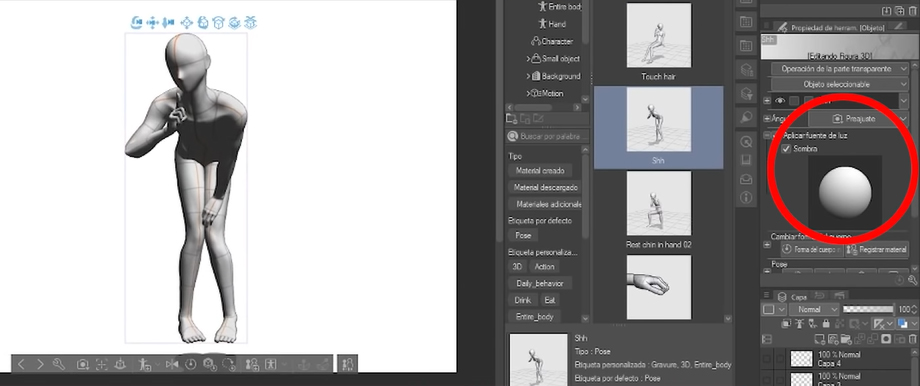 Los usuarios de CLIP STUDIO PAINT, además, contamos con herramientas que pueden facilitarnos mucho la tarea, como las figuras 3D, que podemos iluminar automáticamente a nuestro antojo editando tanto la posición del foco de luz como la pose y el tipo de cuerpo. Una vez que tenemos la figura en el lienzo, podemos acceder a la función de iluminación yendo a la paleta de Propiedad de herram. > Aplicar fuente de luz. Para editar la posición del foco, solo hay que arrastrar la esfera indicada en la imagen de abajo con un círculo rojo. La iluminación de estas figuras puede ser una buena referencia para quienes se están iniciando y para quienes necesitan trabajar con una pose especialmente compleja.