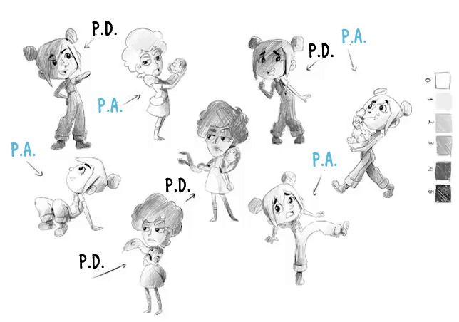 “P.D.” significa punto de luz duro o focal, mientras que “P.A.” es punto de luz ambiental. Las flechas indican la dirección de la luz.