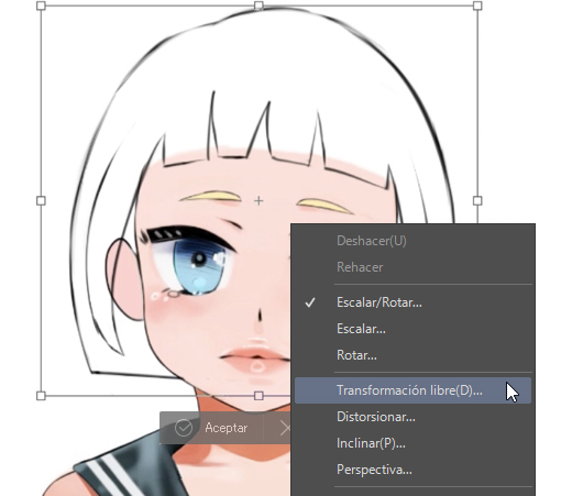 Tras alejar el zoom, he notado que al boceto le falta longitud, así que lo selecciono con la herramienta Lazo y pulso Ctrl + T para abrir la Transformación libre y alargar, mover o distorsionar el boceto, según lo que necesite.