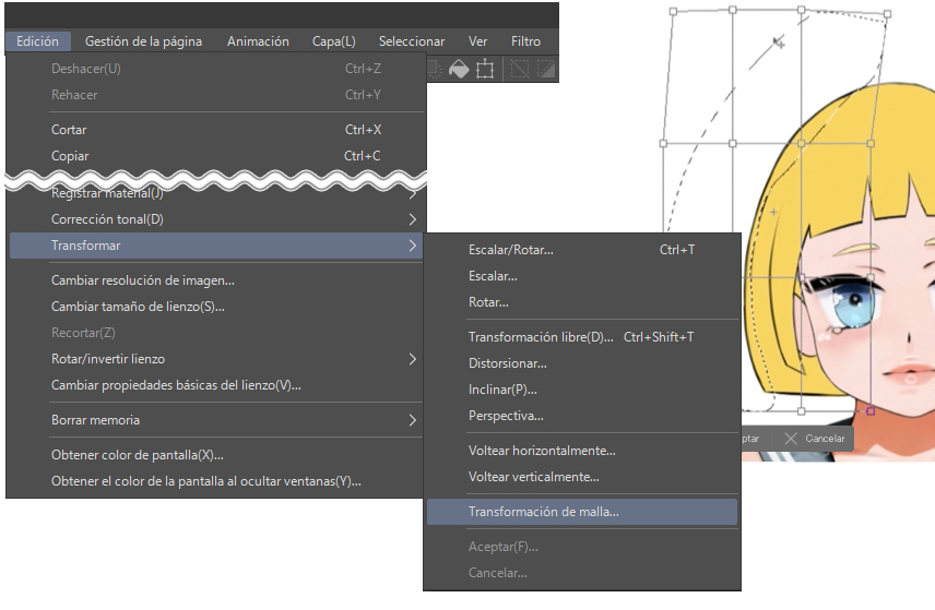 Puedes acceder a la función de Transformación de malla desde el menú [Edición] > [Transformar] > [Transformación de malla].