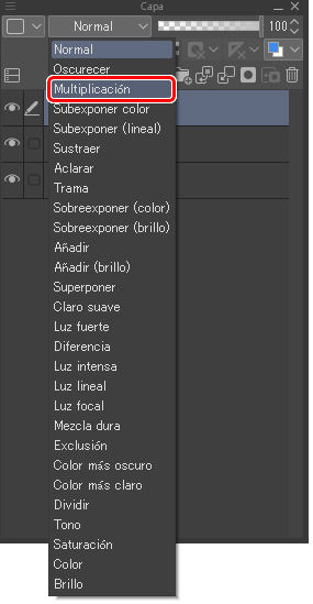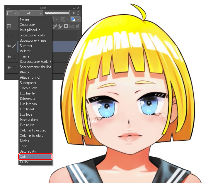 Después, podemos cambiar el modo de combinación de la capa a Color para reducir la opacidad y que el dibujo esté menos saturado, obteniendo así colores más vibrantes.