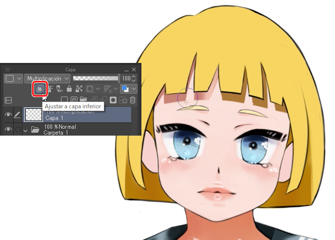 ¡Consejo rápido! Sigue estos pasos para sombrear los mechones del flequillo: creamos una capa justo encima y seleccionamos un color más oscuro. Pintamos el pelo con la herramienta de Relleno. Después, quitamos la parte pintada inferior y movemos la forma hacia abajo. A continuación, ocultamos la capa de Multiplicación para seleccionar todo el pelo automáticamente con la herramienta de selección. Hecho esto, volvemos a hacer visible la capa de Multiplicación y borramos todo lo que hay en la selección.