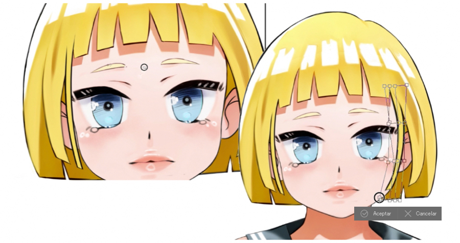 Creo que el peinado es demasiado simple, así que voy a añadirle un par de mechones más para hacerlo más interesante. Para ello, dibujo el izquierdo y lo copio y pego después en la parte derecha, además de voltearlo horizontalmente para que encaje bien. Para rebajar la excesiva simetría, utilizo la función de transformación de malla.