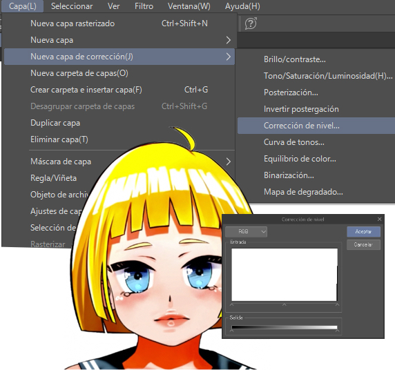 Si crees que tus colores están demasiado apagados, ve al menú [Capa] > [Nueva capa de corrección] y elige la opción Corrección de nivel. Con los deslizadores podrás saturar tus colores tanto como gustes.