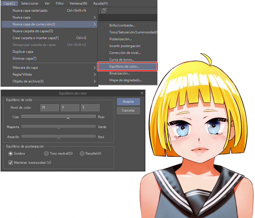 Para el segundo truco debemos acceder a los ajustes de Equilibrio de color, que están en el menú [Capa] > [Nueva capa de corrección] > [Equilibrio de color], para ajustar los tonos cian, magenta y amarillo con los deslizadores. Experimenta con los ajustes hasta encontrar un equilibrio que funcione bien con la imagen.