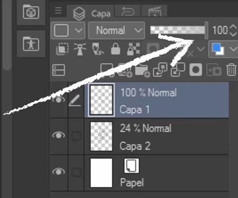 Ya tenemos una pequeña base lista para nuestro dibujo. A continuación, bajamos la opacidad ajustando la barra indicada en la imagen y creamos una capa nueva.