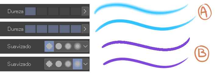 * Dureza / Anti-aliasing: Es el suavizado de los bordes. Podemos observar cómo afecta a los trazos en ambos casos. (A) Dureza, (B) Anti-aliasing.