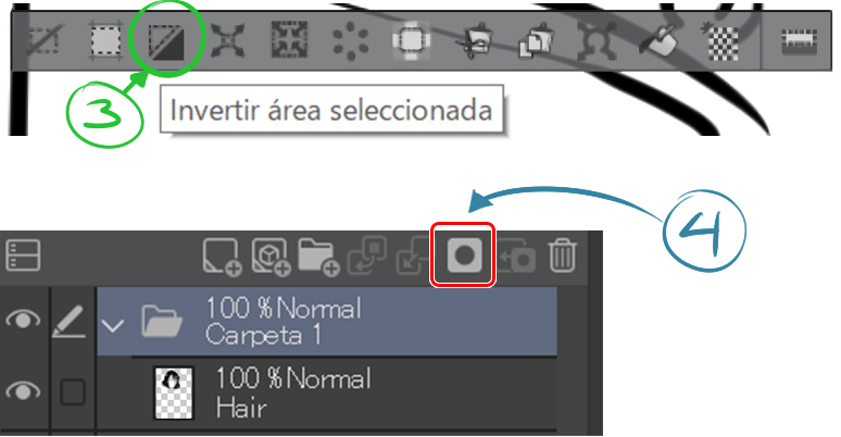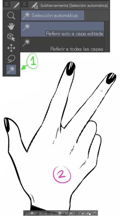 (1) Click en la herramienta de auto selección > (2) Click dentro de la mano, aparecerá un contorno punteado señalando el área seleccionada > (3) invertir la selección > (4) seleccionar la capa del cabello y crear una máscara de opacidad.