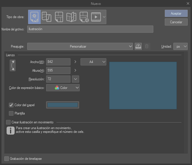 Después, seleccionamos Ilustración como Tipo de obra y formato A4 en horizontal a 72 ppp. También podemos darle el color de fondo que queramos.