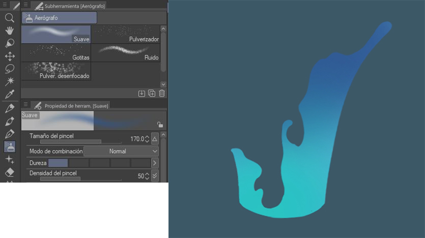 Con la opción ya activada, seleccionamos la herramienta Aerógrafo suave y aplicamos un color azul oscuro en la parte superior y un azul verdoso en la inferior. En este paso es aconsejable trabajar con el aerógrafo a un gran tamaño y una densidad del 50 %.