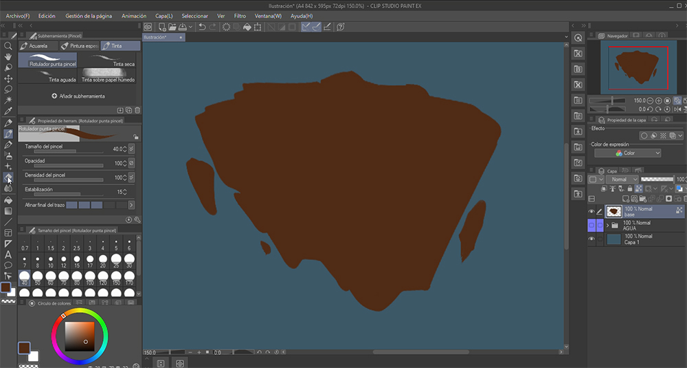 Los pasos para este segundo elemento son similares al anterior. Empezamos por crear una capa nueva y dibujar su forma base con un color marrón. Esta vez utilizaremos ha herramienta Tinta > Rotulador punta pincel, ya que tiene una forma más irregular y nos vendrá bien para crear nuestras rocas.