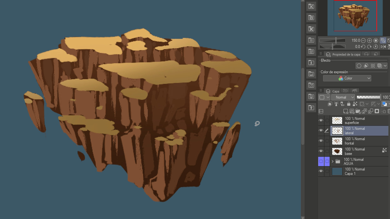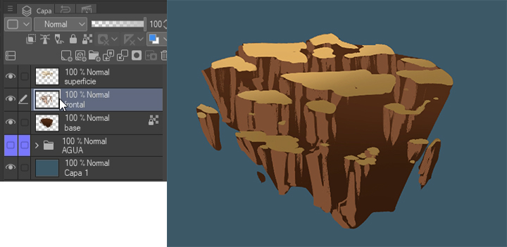 El siguiente paso es volver a crear otra capa, con el nombre Frontal, para pintar los planos verticales de las rocas. Es importante colocar esta capa entre las dos primeras:
