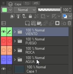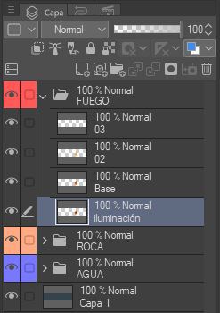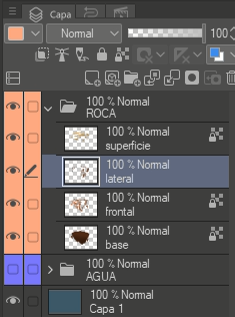 Para seguir con la misma organización, creamos una carpeta en la que metemos las 4 capas que hemos creado para el elemento roca. También podemos usar los colores de capa de la esquina superior izquierda para organizar visualmente el espacio. En este caso he elegido el naranja.