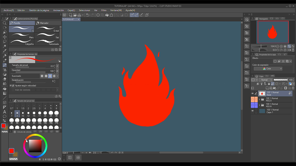 Comenzamos creando una nueva capa y dibujando en ella la forma de una llama con la herramienta Plumilla > G. Para esto utilizaremos un color rojo anaranjado bien fuerte.