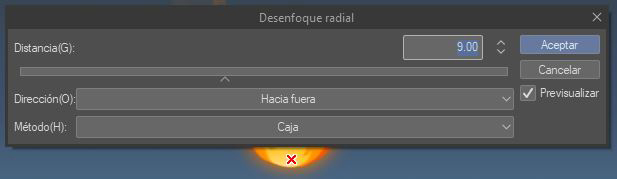 Al editar este desenfoque aparecerá en el lienzo una cruz roja y blanca. Es importantísimo colocar este punto en la base del fuego para que la dirección del desenfoque parta desde ahí.