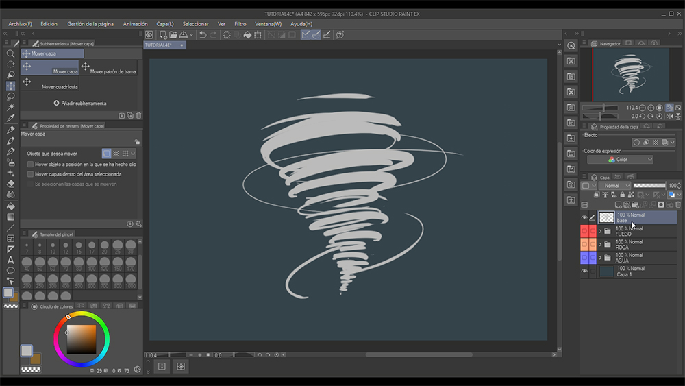 Como en las otras tres ocasiones anteriores, empezaremos por crear una nueva capa a la que llamaremos Base. En ella trazamos unas líneas curvas con la herramienta Plumilla > G en un color gris muy claro. Empieza pintando unas líneas gruesas y grandes por arriba y ve disminuyendo su tamaño y grosor a medida que bajas. Después, traza alrededor unas líneas finas desordenadas para dar más sensación de movimiento.
