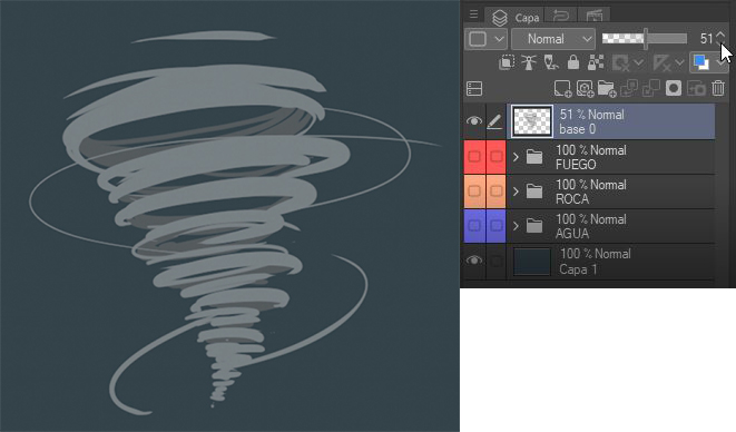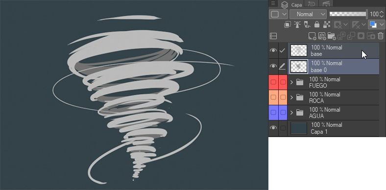 A continuación, creamos una capa nueva (Base 0) y la colocamos debajo de la capa Base. En esta capa aplicamos la parte interna del viento con un gris más oscuro.