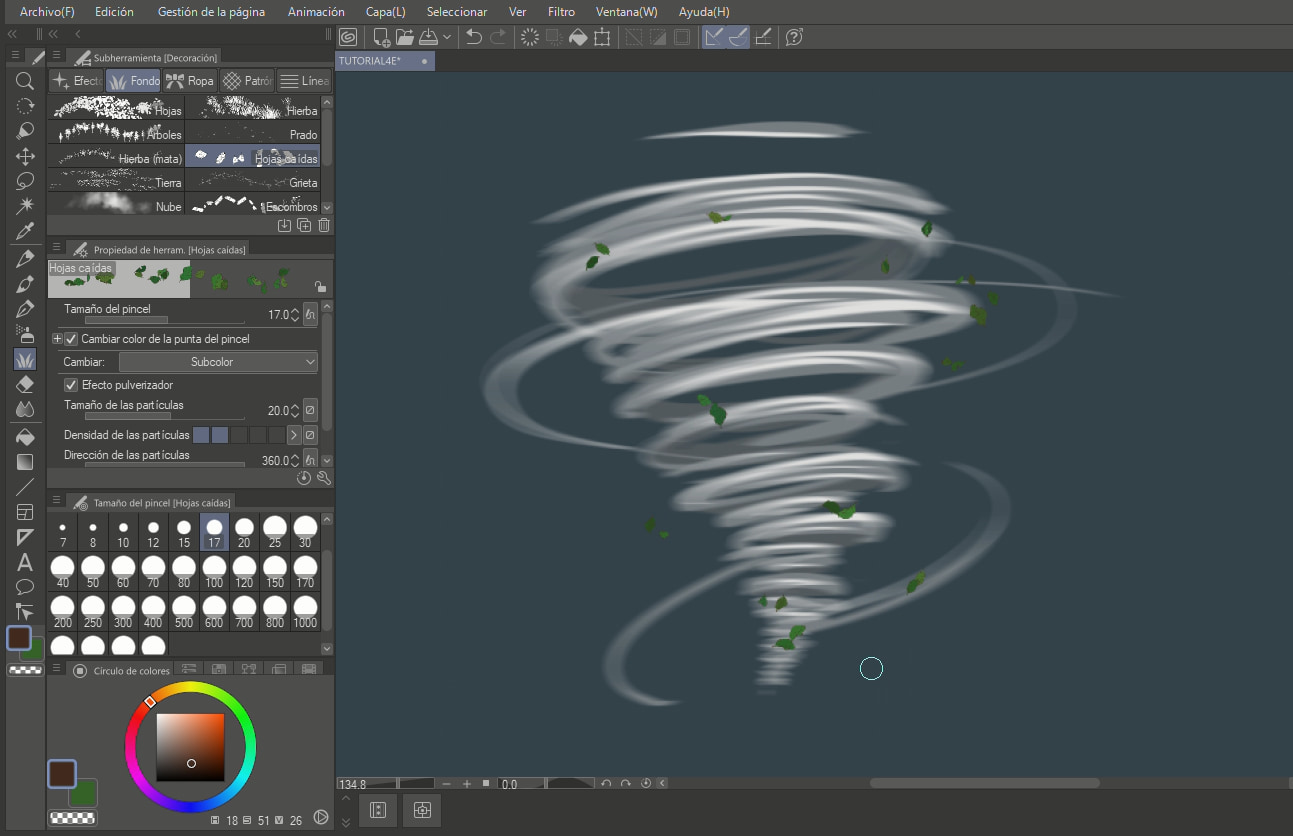 Después de esto, para ir terminando y darle unos últimos retoques que ayudarán a enfatizar este efecto de movimiento, añadimos unas hojas volando alrededor en una nueva capa. Seleccionando la herramienta Decoración > Fondo > Hojas caídas y los colores que veréis en la siguiente imagen, las colocamos por distintas zonas del objeto principal.