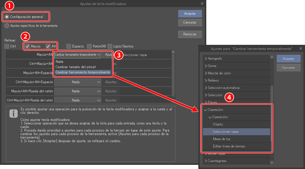 - En el menú desplegable de Mayús + Alt, selecciona Cambiar herramienta temporalmente.