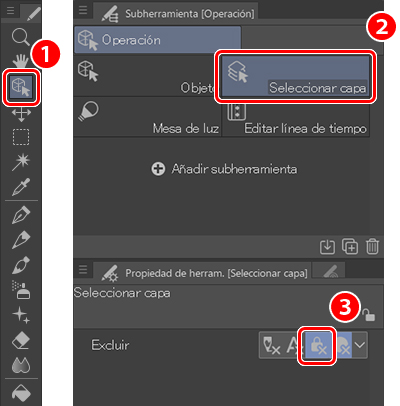 - Después, en la paleta Propiedad de herramienta, activa el icono del candado (Excluir capas bloqueadas).