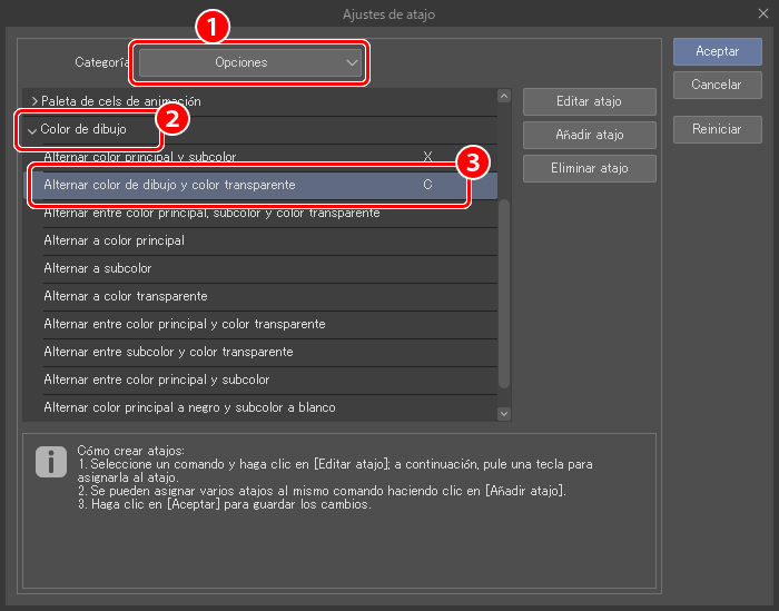 - Asigna un atajo para Alternar color de dibujo y color transparente (yo he asignado la tecla “L” porque soy zurdo y utilizo la parte derecha del teclado para los atajos, pero siéntete libre de usar la que prefieras).