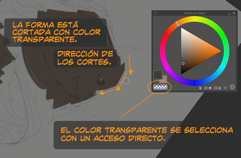 - Repito las acciones del paso 1 (colores planos) y corrijo una por una las formas de las sombras con la función Alternar color de dibujo y color transparente, además de la función Ajustar a capa inferior.