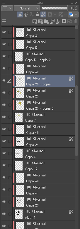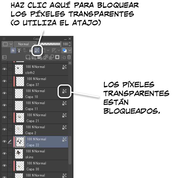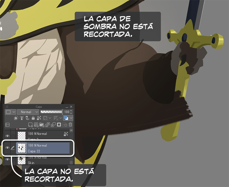 Para facilitar la última capa de pintura, separo todas las formas (colores planos y sombras) con la función Bloquear píxeles transparentes. Tengo asignado un atajo para esta función, ya que voy corrigiendo la forma del sombreado mientras aplico la última capa de pintura.