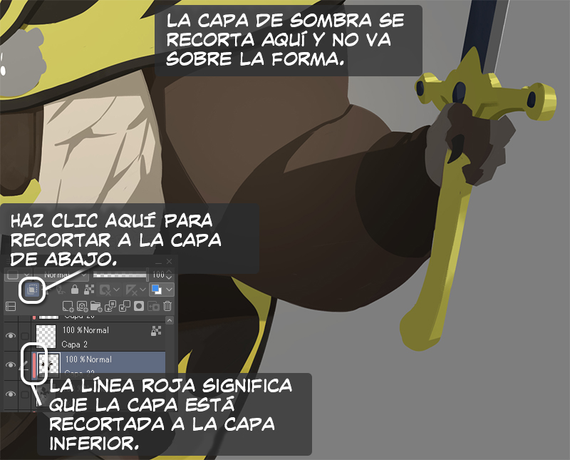 - Creo una nueva capa para las sombras que quiero ajustar a una forma. Al ajustar la capa del sombreado a la capa inferior, puedo mantener mis trazos siempre dentro de la forma que hay en la capa inferior.