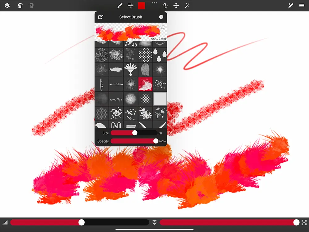 Las paletas de la interfaz de usuario aparecen en pantalla después de seleccionarlas y se desvanecen tras su uso, manteniendo el área del lienzo sin obstáculos. Hay más de 140 pinceles predeterminados para ofrecerte una plétora de opciones para una sensación tradicional.