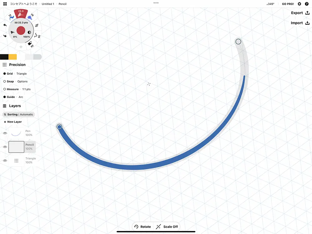 Concepts es una aplicación de arte basada en vectores que te permite hacer notas y bocetos en un lienzo infinito. A medida que dibujas, el papel cuadriculado se expande automáticamente para darte más espacio. Esta función resulta muy útil para esbozar guiones gráficos o diseñar productos. También es ideal para apuntar ideas rápidamente o hacer mapas mentales. Concepts guardará tus archivos como datos vectoriales para que sea más fácil ampliarlos, reducirlos y editarlos.