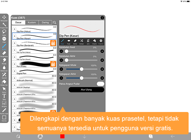 Namun, salah satu kekurangannya adalah performa sapuan kuas yang terasa lambat, terlepas dari perangkat yang digunakan. Hal ini bisa membuat pengalaman menggambar terasa kurang responsif dan butuh waktu untuk terbiasa. Jika performa kuas yang cepat menjadi prioritas, aplikasi seperti Clip Studio Paint lebih direkomendasikan untuk pengalaman menggambar yang lebih mulus.