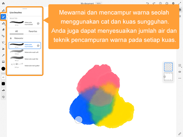 Keunggulan utama Adobe Fresco ada pada kuas hidupnya (live brushes) yang menirukan cara cat tradisional bercampur dan meresap di atas kanvas. Anda bisa mengatur jumlah air dan intensitas campuran warna, misalnya kuning dan biru yang berpadu alami menjadi hijau. Selain menonjol untuk gaya seni tradisional, Fresco juga memungkinkan penggunaan kuas raster dan vektor di kanvas yang sama. Seperti Clip Studio Paint, Anda bisa menciptakan hasil menyerupai cat air atau cat minyak, tetapi dengan fleksibilitas grafis vektor.