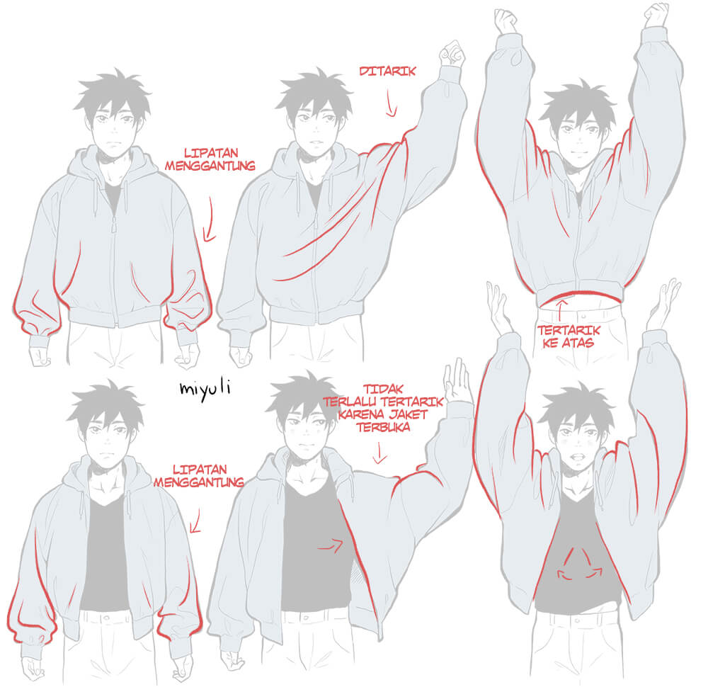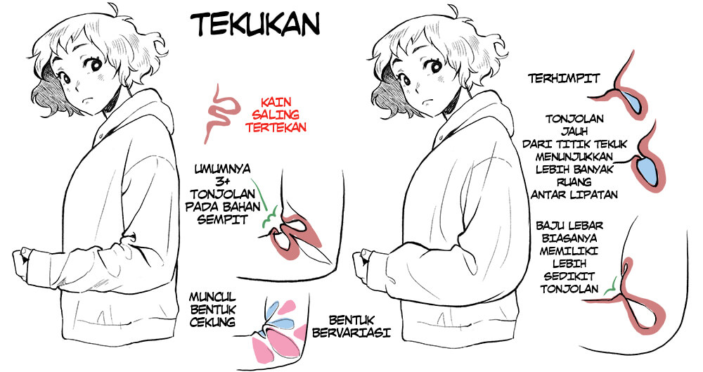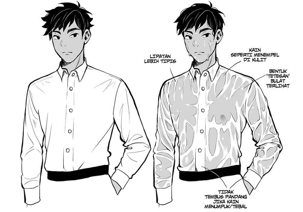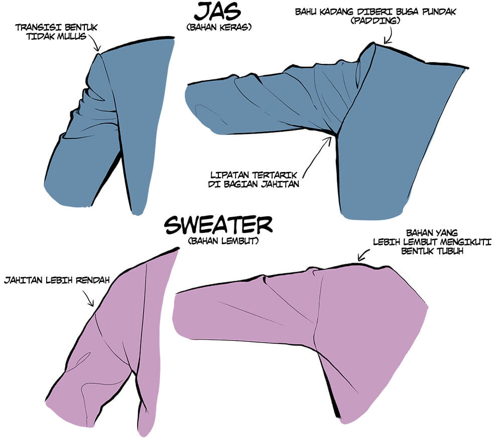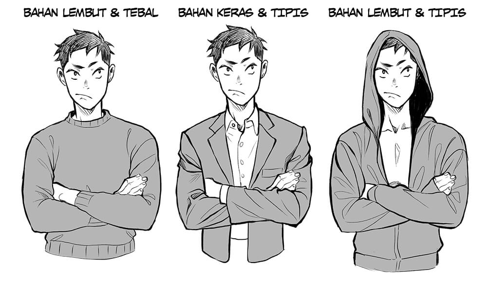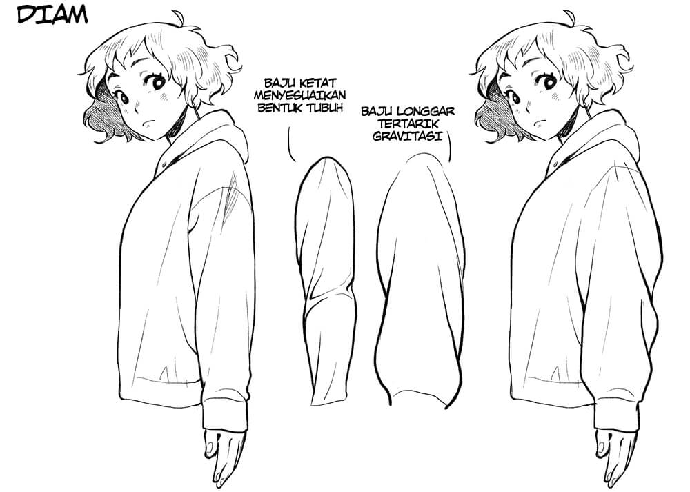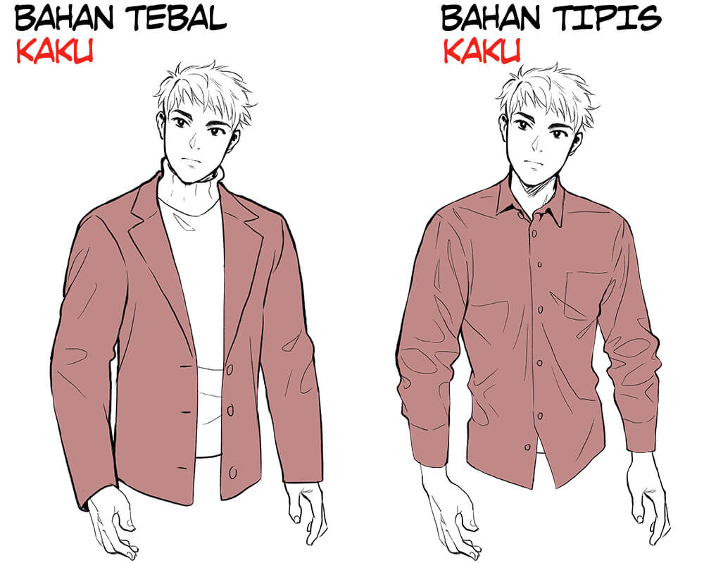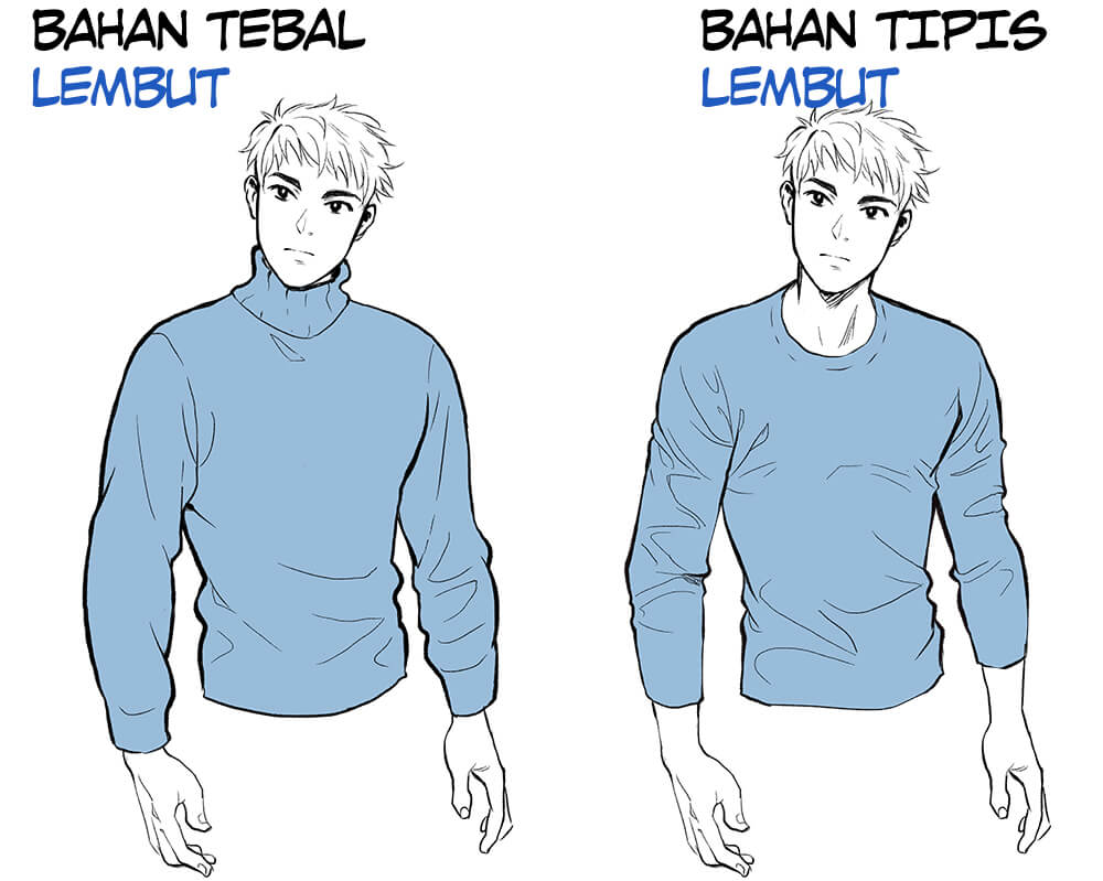 Catatan: Ketika menggambar pakaian dan lipatan, sebaiknya pertimbangkan terlebih dahulu bahan yang cocok dengan kepribadian karakter.