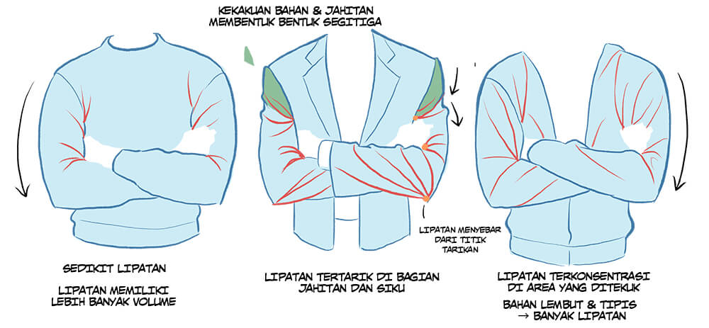 Perhatikan bahwa bahan yang lebih ringan dan tipis pada contoh di atas menunjukkan lipatan yang lebih sedikit karena lengan masih dalam posisi diam.