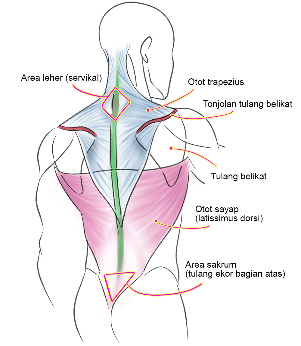 Sementara itu, otot latissimus dorsi (dorsal) terletak di bagian bawah batang tubuh. Otot ini lebar dan datar, menutupi sebagian besar tulang belakang hingga ke sakrum.