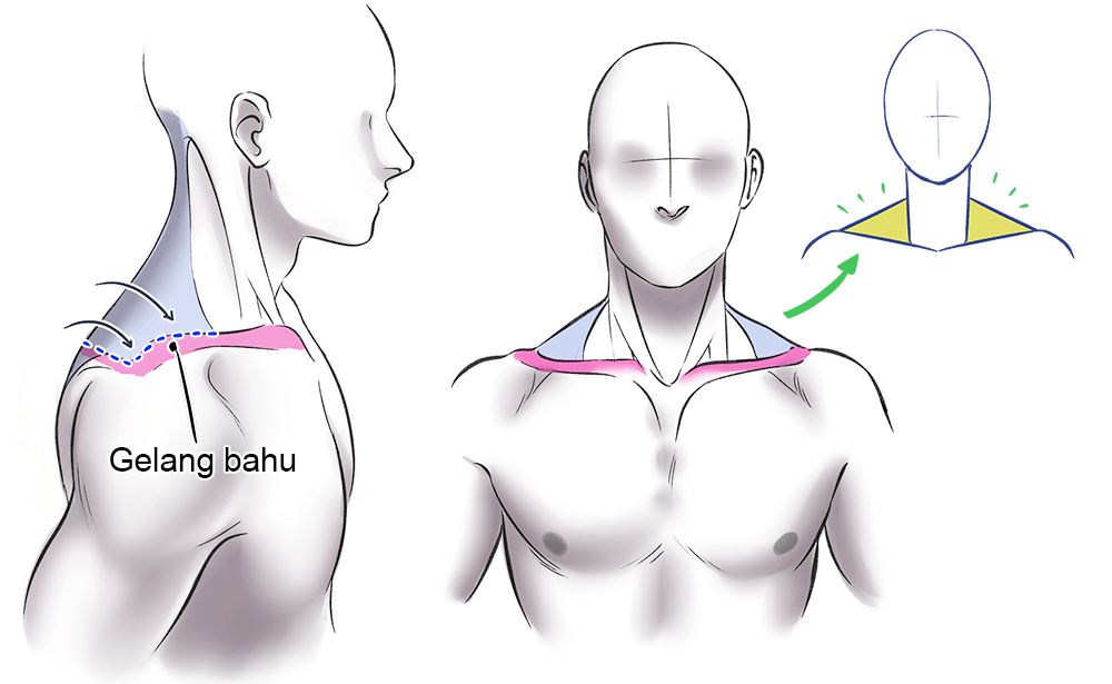 Di area leher, Anda biasanya akan melihat sebuah lekukan kecil. Lekukan ini akan terlihat saat Anda menjepitkan tulang belikat Anda (A). Ketika otot dalam keadaan santai, Anda mungkin melihat beberapa tulang di tulang belakang yang menonjol (B).
