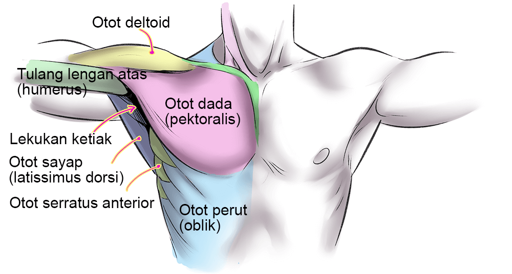Di sisi lain, otot dorsal melekat pada humerus di bawah ketiak, memungkinkan lengan untuk meregang dan mengkerut. Otot ini berbentuk datar dan tidak mudah terlihat dari depan, kecuali untuk bagian kecil di bawah lengan.